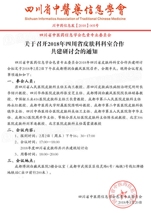 白癜风是一种常见的皮肤黏膜色素脱失性的疾病,已俨然成为人类一个严峻的健康问题,为了给深陷疑难型白癜风困扰的患者带去康复的希望,2.2日由四川省中医药信息学会色素专业委员会、白癜风临床科研中心共同发起的“2018四川省皮肤科合作共建研讨会”成功在我院召开。